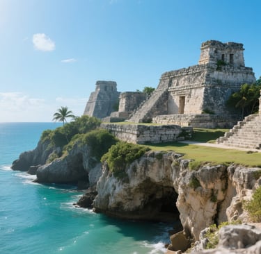 The Tulum Ruins, perched above the sea, are breathtaking at sunrise. The sky turns gold, and the ancient stones catch the first light of the day — a perfect blend of history and peace.